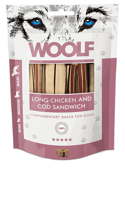Woolf Long Chicken and Cod Sandwich godbidderne er lavet af 84% kylling og 10% torsk, hvilket giver en velsmagende og næringsrig snack til din hund. Stivelse (2%) og glycerin (0,5%) er tilføjet for at sikre en god konsistens og længere holdbarhed. Godbidderne er helt fri for kemiske tilsætningsstoffer, konserveringsmidler og farvestoffer, hvilket gør dem til et sundt valg.