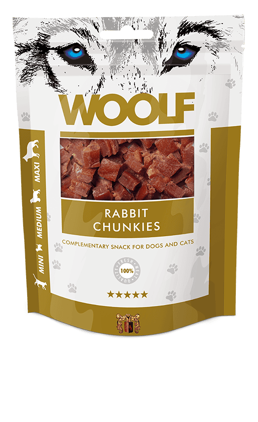 Woolf Rabbit Chunkies er små, møre bidder af kanin og ærteprotein, ideelle til små hunde og katte! Disse godbidder er lavet af 100% protein-kilder for at sikre den højeste kvalitet og bedste ernæringsmæssige indtag. Godbidderne er helt fri for kemiske tilsætningsstoffer, konserveringsmidler eller farvestoffer. Glycerin (3%) sikrer en god konsistens og længere holdbarhed.